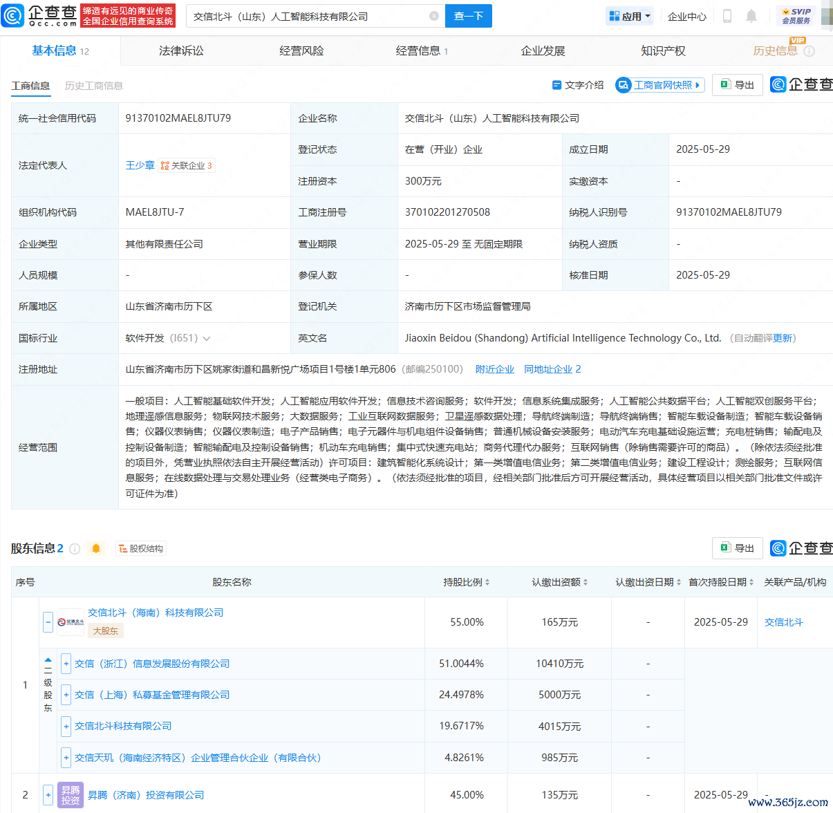 企查查APP袒露开云官网登录入口 开云app官网入口,近日,交信北斗(山东)东谈主工智能科技有限公司成就,法定代表东谈主为王少章,注册老本为300万元,狡计规模包含:东谈主工智能基础软件开垦;东谈主工智能行使软件开垦;信息技艺扣问办事;软件开垦;信息系统集成办事;东谈主工智能全球数据平台等。企查查股权穿透袒露,该公司由信息发展(300469)旗下交信北斗(海南)科技有限公司、昇腾(济南)投资有限公司共同抓股。
