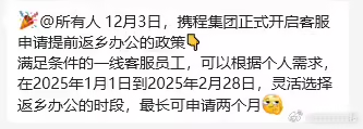 新浪科技讯 12月4日上昼音信,新浪科技获悉,携程集团近日开启客服央求提前返乡办公计谋,中意条目的一线客服职工体育游戏app平台,不错凭证个东谈主需求在2025年1月1日到2025年2月28日,纯真遴荐返多办公的时段,最长可央求两个月。
