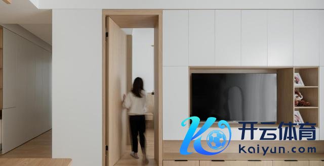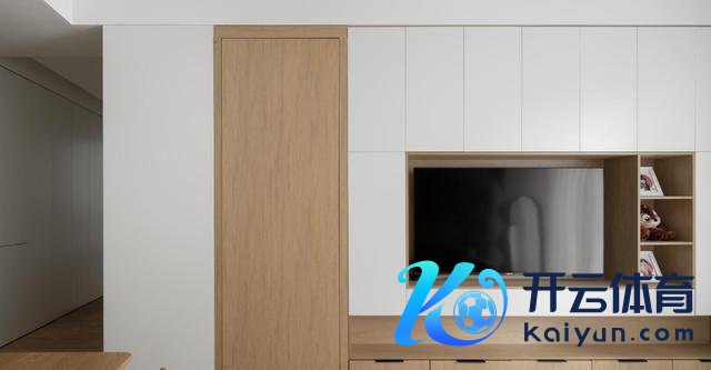 电视墙取舍柜体来想象,可以说是相比常见的不停手法了,毕竟小户型自身就很缺收纳区。不外有少量想象很细节,即是将附近的主卧门作念到顶,并取舍隐形想象,既均衡了视觉脉络,又起到了拉伸视觉层高的作用。