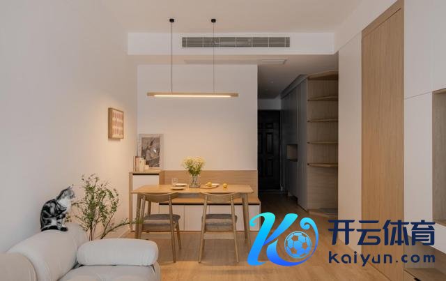 通过玄关区即是餐厅,由于空间不大,借用卡座的手法来想象,不仅起到了省俭空间的作用,也兼具了一定的储物智力。虽说空间想象相比单一,但在暖色灯光的映衬下,也让屋主用餐时更有氛围感了。