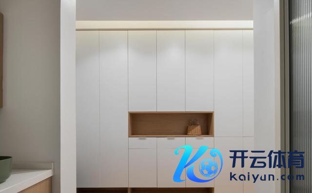 入户侧面想象整面墙的储物柜,并取舍转角的容貌,延迟至附近的过说念。这么一来,既带来了大量的储物智力,视觉上也起到了动线携带的作用。