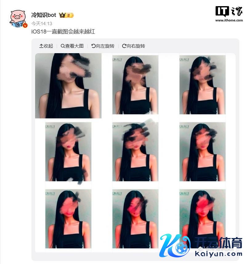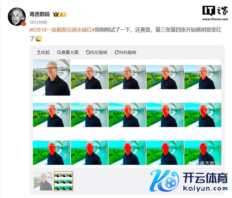 IT之家 1 月 16 日讯息,最近有网友发现iOS 18 系统有一个奇怪的 bug,升级 iOS 18.2 后,对一张截图再次截图,然后一直轮回下去,图片就会越来越红,以致让东说念主像像片形成“红孩儿”。这一风景在本日激发网友热议。