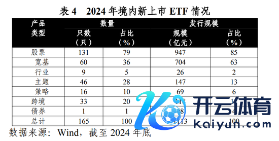 从增量来看,2024年,境内ETF鸿沟增长1.6万亿元,其中存量家具鸿沟竣事了近1.4万亿元的增长,占比近九成;新发财具孝顺了约0.2万亿元的鸿沟增量,占比约一成。新发财具方面,2024年境内ETF市集新增165只家具上市,刊行鸿沟共计1113亿元。其中131只股票ETF,刊行鸿沟占比85%。131只股票ETF中60只为宽基ETF,占总刊行鸿沟比重超六成,涵盖了中证A系列(A50、A100、A500)、上证系列(上证180、科创50、科创200)、沪深300、宽基指增等垂危家具。