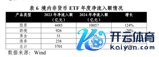 同期,2024年境内ETF市集资金净流入创历史新高。2024年全年非货ETF净流入近1.2万亿元,较2023年增长110%。其中,股票ETF净流入最高,超1万亿元。