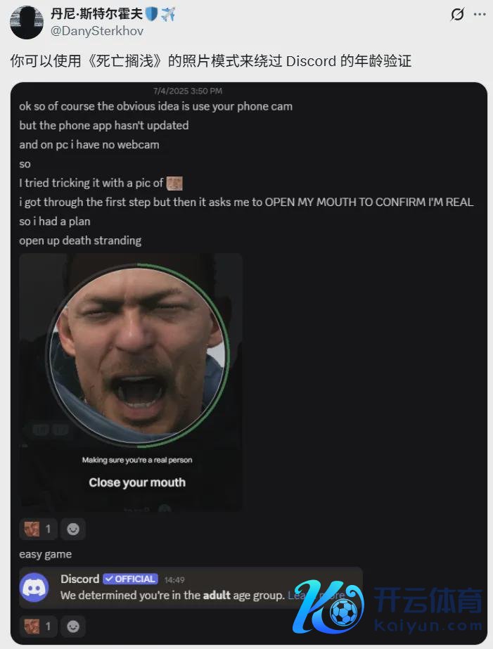 不仅典型的成东说念主网站受到严格截至,诸如Discord、Reddit、Bluesky等提供酬酢互动的平台也无法避免。以至于前段时辰英国玩家纷纷用《死字搁浅》山姆的脸蒙混过关,随机让山姆成了各个网站的“常客”。